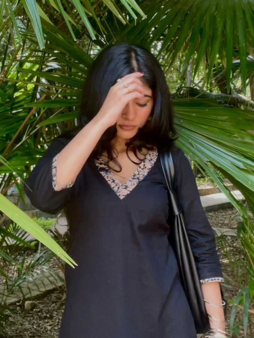 Kavya Black Kalamkari V- Neck Short Kurti